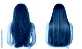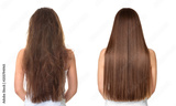 Woman before and after hair treatment on white background