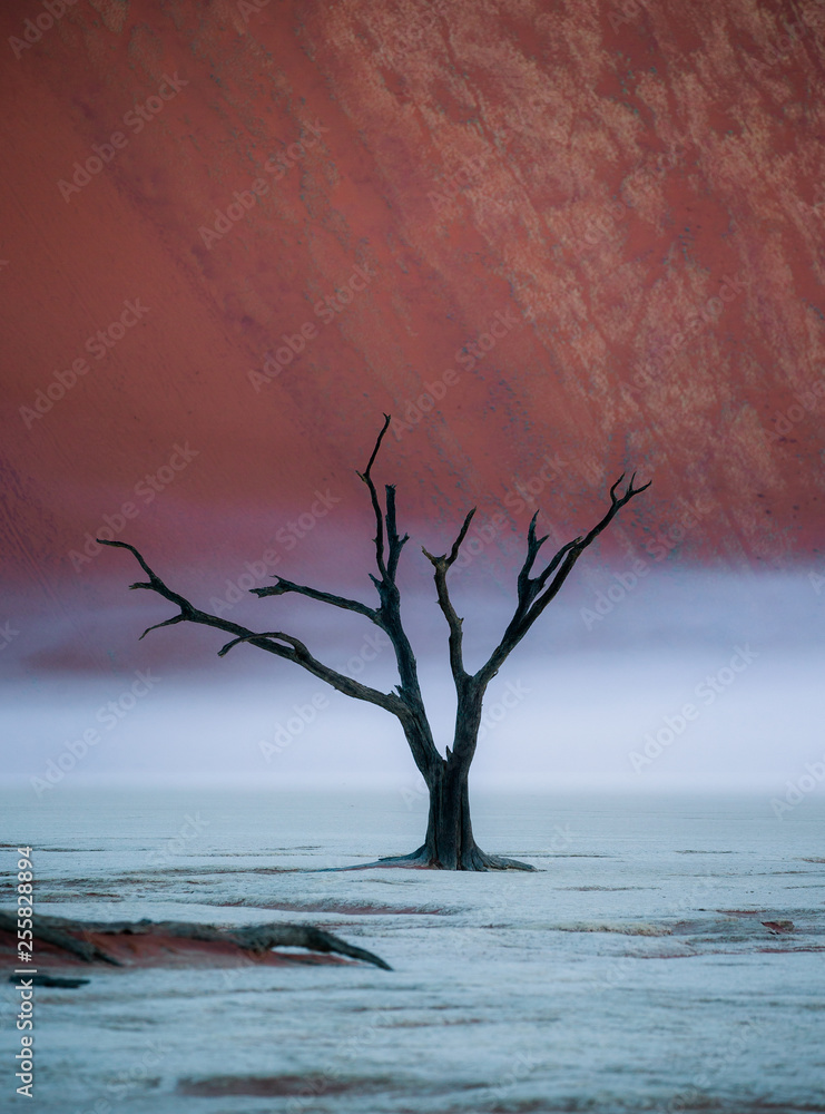 Dead acacia tree on the background of sand dunes and stripes of morning fog. A very rare natural phenomenon for these places. Stunning light, color and shape. Africa. Landscapes of Namibia. Sossusvle