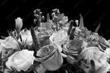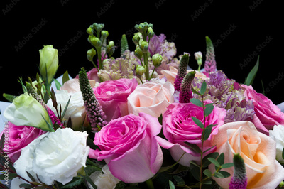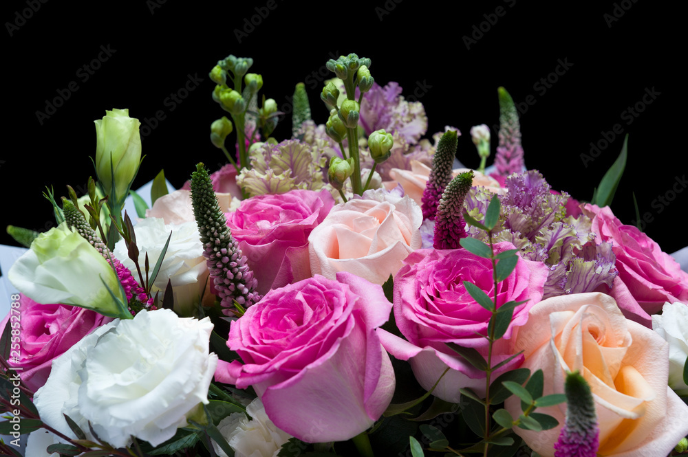Flower bouquet, bunch of pink and peach roses, white lisianthus, red veronica spicata or garden speedwell and green eucalyptus isolated on black background, springtime concept, selective focus