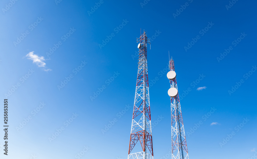 Colorful mobile phone network telecommunication towers against blue sky background. Concept of telecom, telco, connectivity, and technology