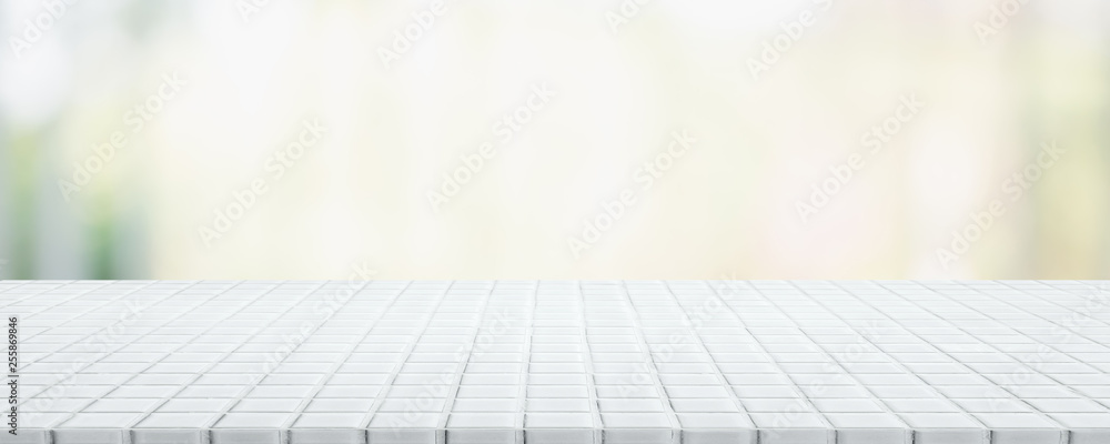 Empty white ceramic mosaic table top and blurred bokeh cafe and restaurant banner background with vintage filter - can used for display or montage your products.