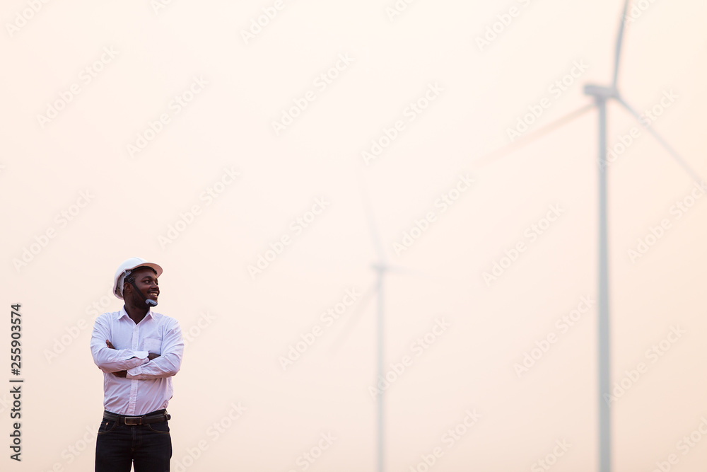 African engineer wearing white hard hat standing with digital tablet against wind turbine on sunny day
