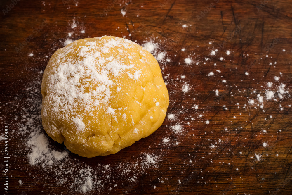ball of dough sprinkled with flour on a wooden cutting board, copy space