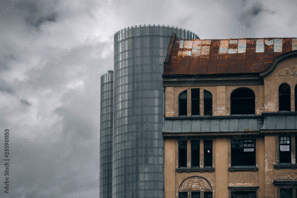 A new modern glass skyscraper and a destroyed old building. Old area ready for demolition. Very dramatic and contrast photo
