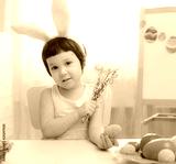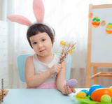 Little girl in bunny ears are playing with Easter eggs. Kids celebrating Easter.