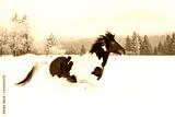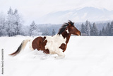 Brown and white horse running on deep snow covered country, trees and mountains in background.