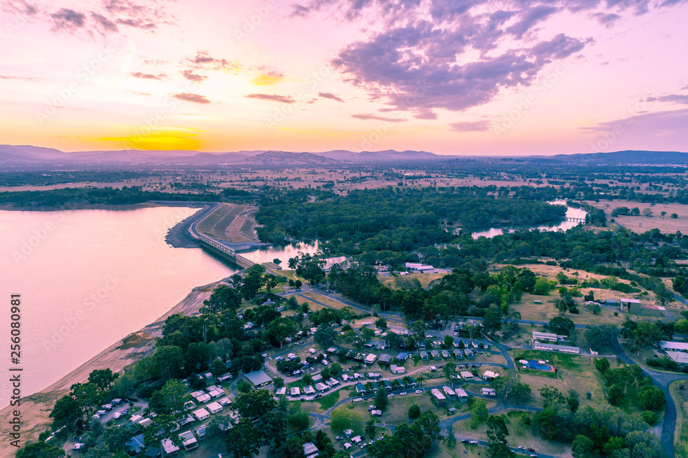 Lake Hume Village and Murray River at dusk - aerial landscape