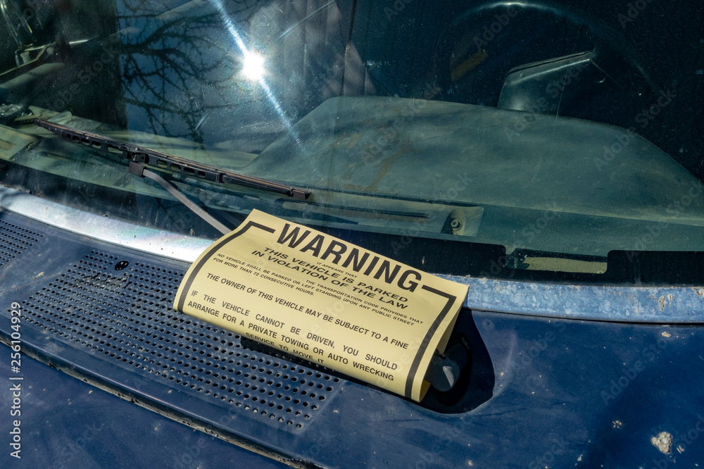 Warning notice on truck windshield to move car within 36 hours or be towed.