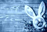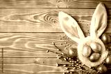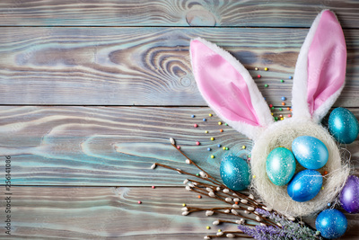 Happy Easter. Congratulatory easter background. Background with copy space. Selective focus. Top view. Horizontal.