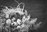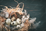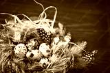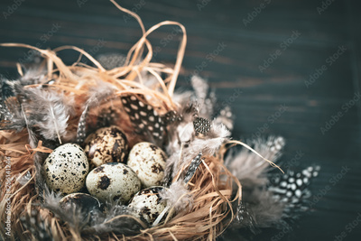 Quail eggs on old wooden background. Happy Easter. Top view. Free copy space. Selective focus.