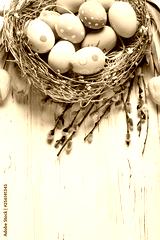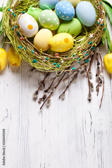 Happy Easter. Congratulatory easter background. Easter eggs and flowers. Background with copy space. Selective focus. Top view.