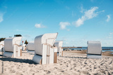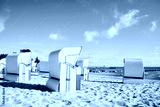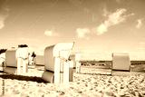 Wicker beach chairs on empty sandy beach, color toning applied.