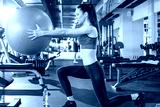 Side view of slim young woman in sportswear doing exercises with fitness ball in gym