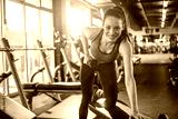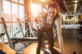 Sportswoman lifting dumbbells on exercise bench at gym