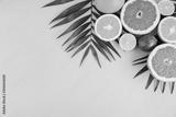 Summer fruits. Tropical palm leaves, lime, grapefruit and orange on yellow background. Flat lay, top view, copy space