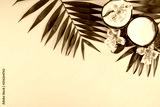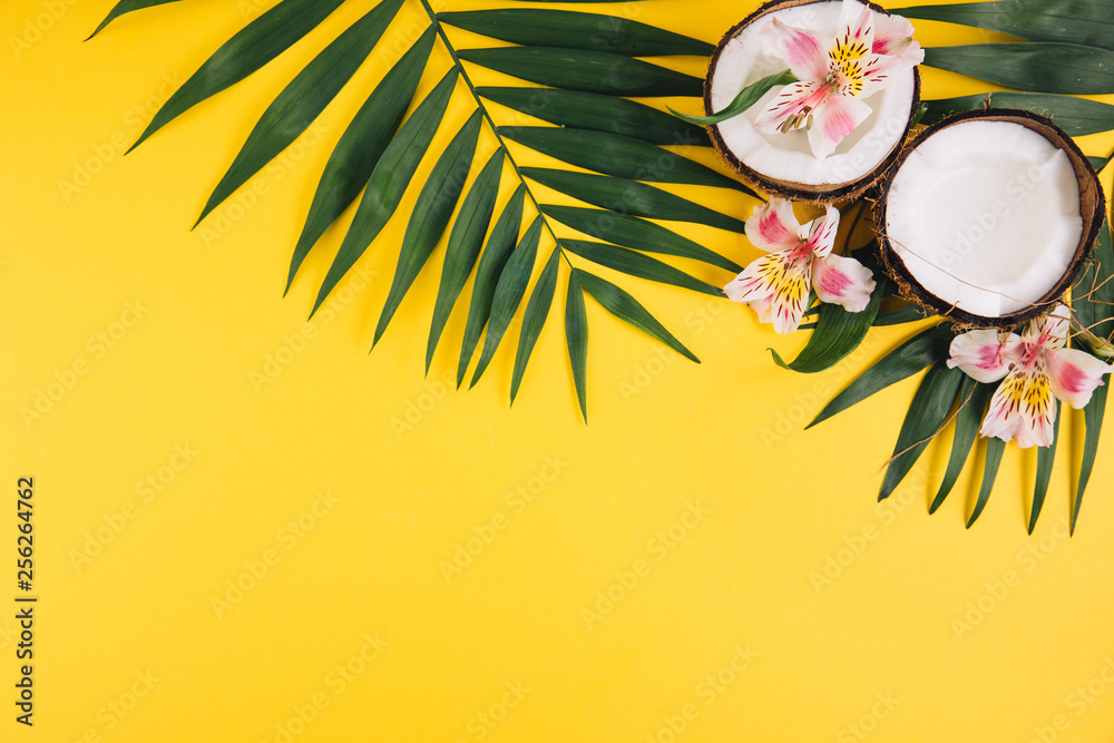 Summer fruits. Tropical palm leaves and coconut on yellow background. Flat lay, top view, copy space