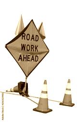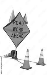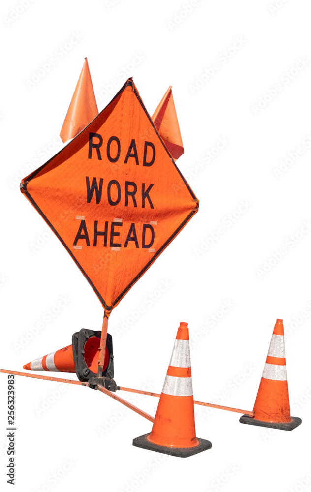 Orange ROAD WORK AHEAD sign with safety cones and flags. Isolated.