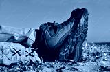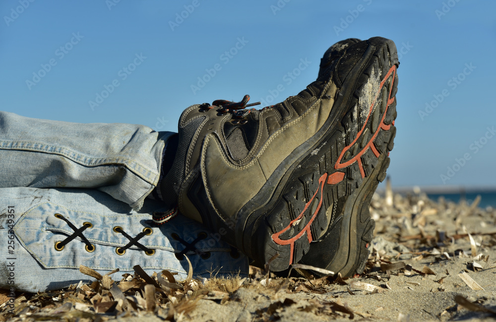 fuß im wanderschuh mit jeans liegt am strand in der sonne am meer