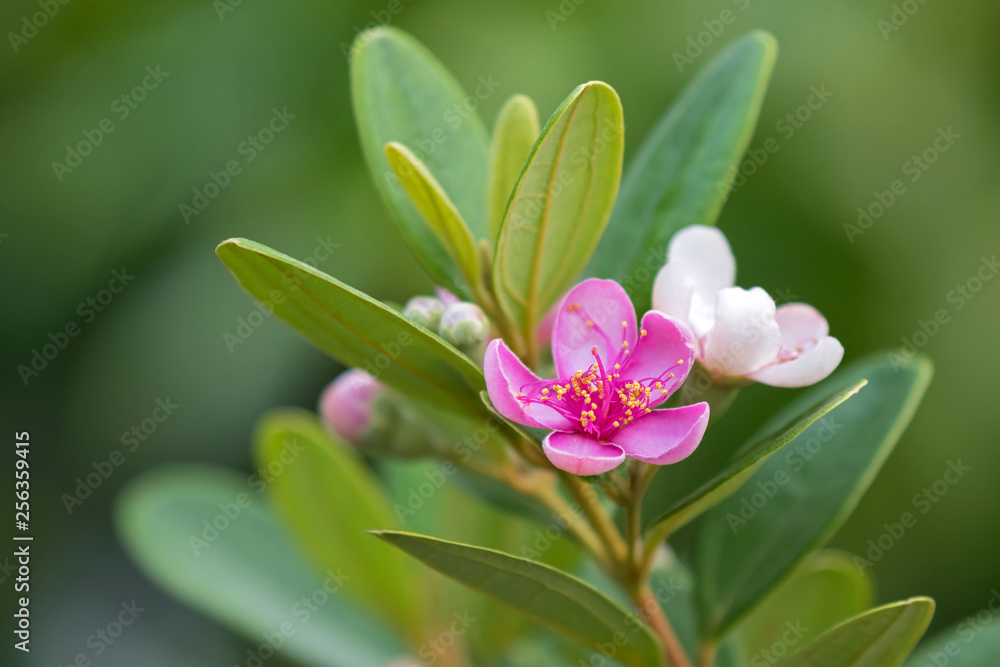 Pink flowers of Rose Myrtle growing in Singapore, Asia (Rhodomyrtus tomentosa