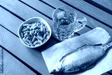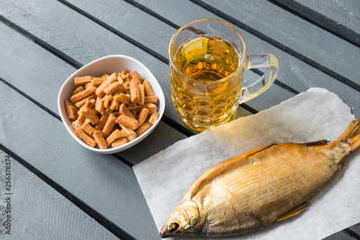 mug of light beer, a plate of crackers, smoked fish on a wooden background