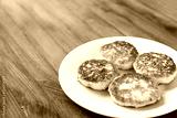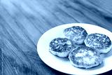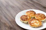 4 cheesecakes on a white plate on a wooden background, pancakes made of cottage cheese