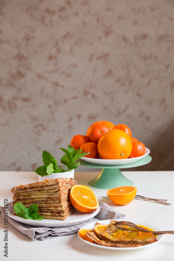 Crêpes Suzette is a French dessert consisting of a crêpe with a sauce of caramelized sugar and butter, tangerine or orange juice, zest and orange liqueur.