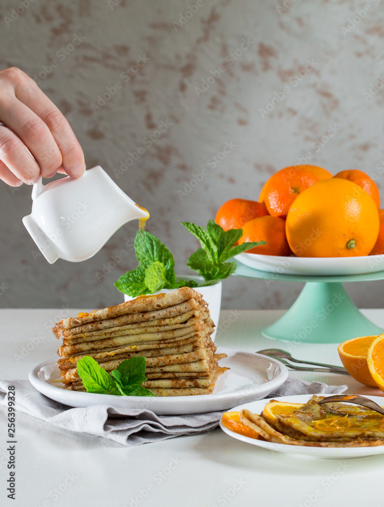 Crêpes Suzette is a French dessert consisting of a crêpe with a sauce of caramelized sugar and butter, tangerine or orange juice, zest and orange liqueur.