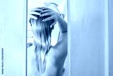 Blonde girl washes her hair in the shower back view