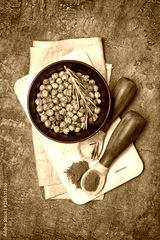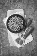 Roasted spicy chickpeas in black bowl with rosemary, sea salt and red pepper in wooden spoons