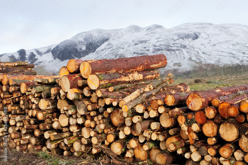 Logs of wood stacked for winter energy fuel at snow season in forest and woodlands
