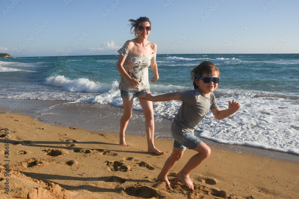 Happy family enjoying on beach. Summer vacation, family with one child having fun on beach