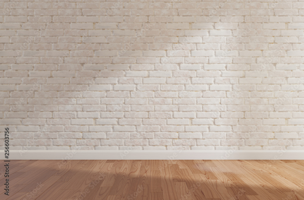White brick wall and wooden floor, mock up,copy space,3d rendering