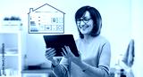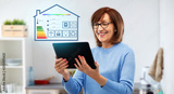 technology, automation and efficiency concept - smiling senior woman in glasses with tablet computer using smart home app over grey background