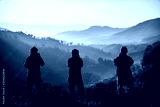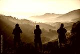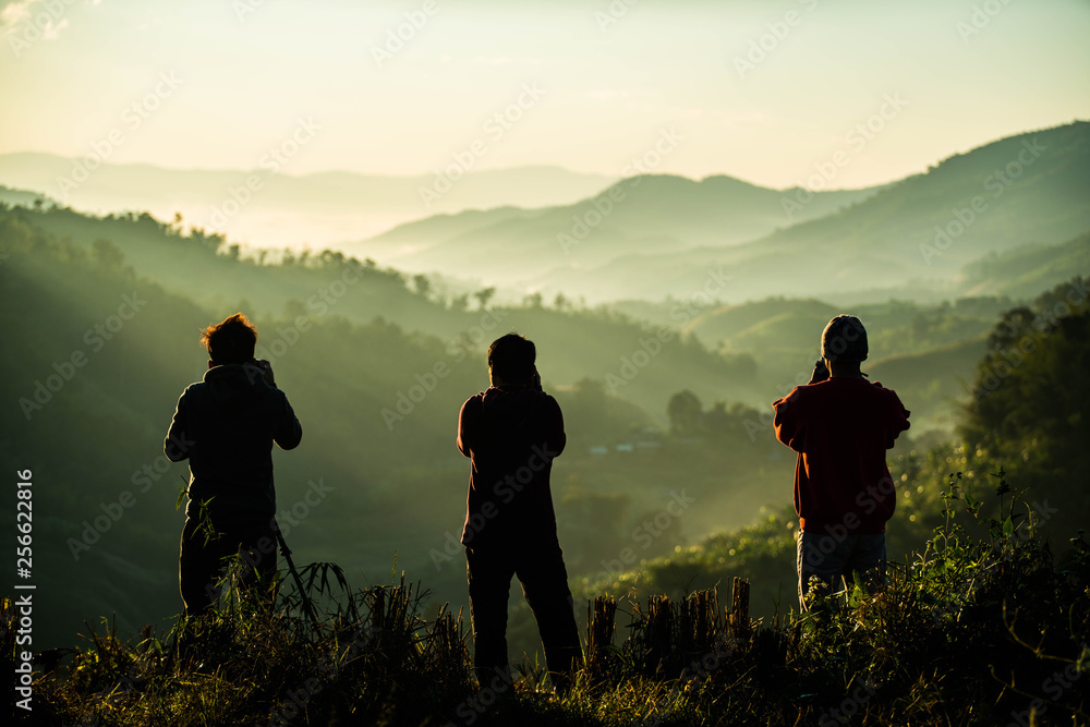 Silhouette of three photographers taking landscape pictures of morning mist on the mountain