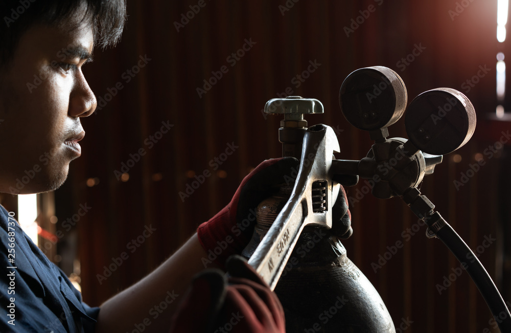 Engineer securing regulator for oxygen tank used in welding - Mechanic fastening valve on gas tank using adjustable wrench in workshop