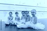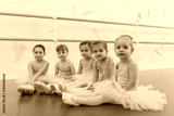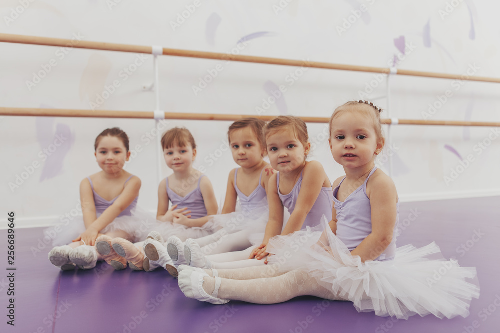 Lovely little girls looking to the camera, sitting on the floor at ballet school. Adorable little ballerinas rest after exercising. Group of little girls dancers wearing leotards relaxing after ballet