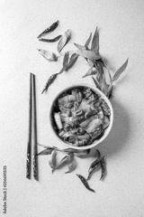 Korean traditional fermented appetizer kimchi cabbage salad in ceramic bowl with shopsticks and Vietnamese oregano greens over grey spotted background. Flat lay, space.