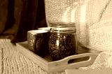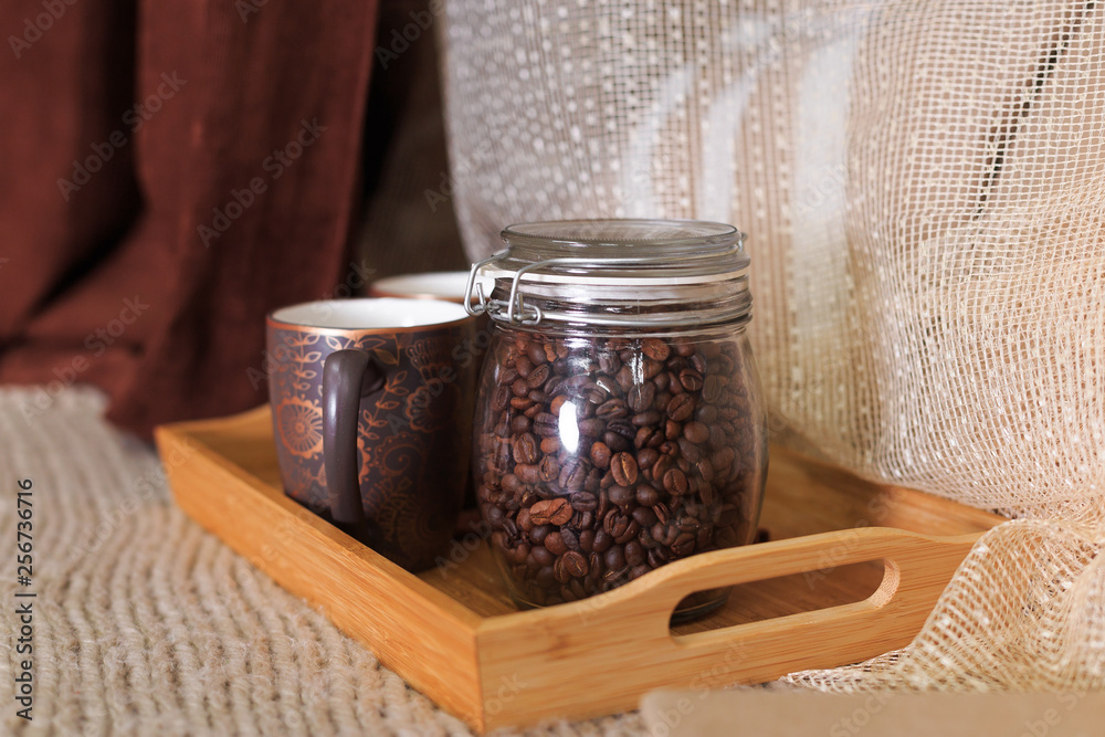 a Cup of coffee and a jar of coffee beans on a wooden tray