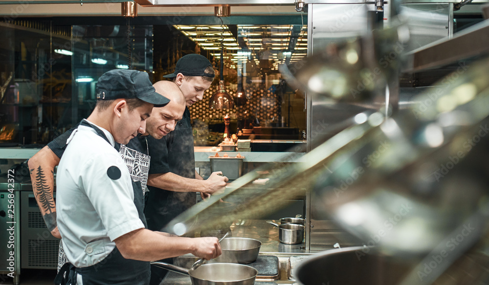 Culinary school. Strict young chef in apron looking carefully how his assistant cooking at restaurant kitchen