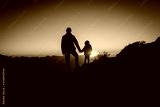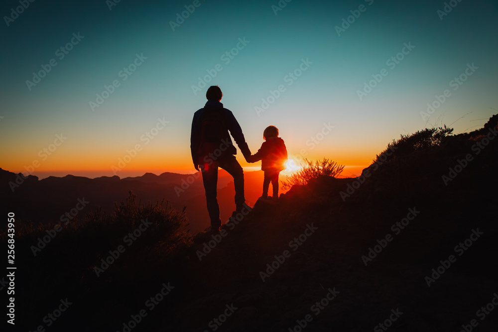 father and little daughter travel in mountains at sunset