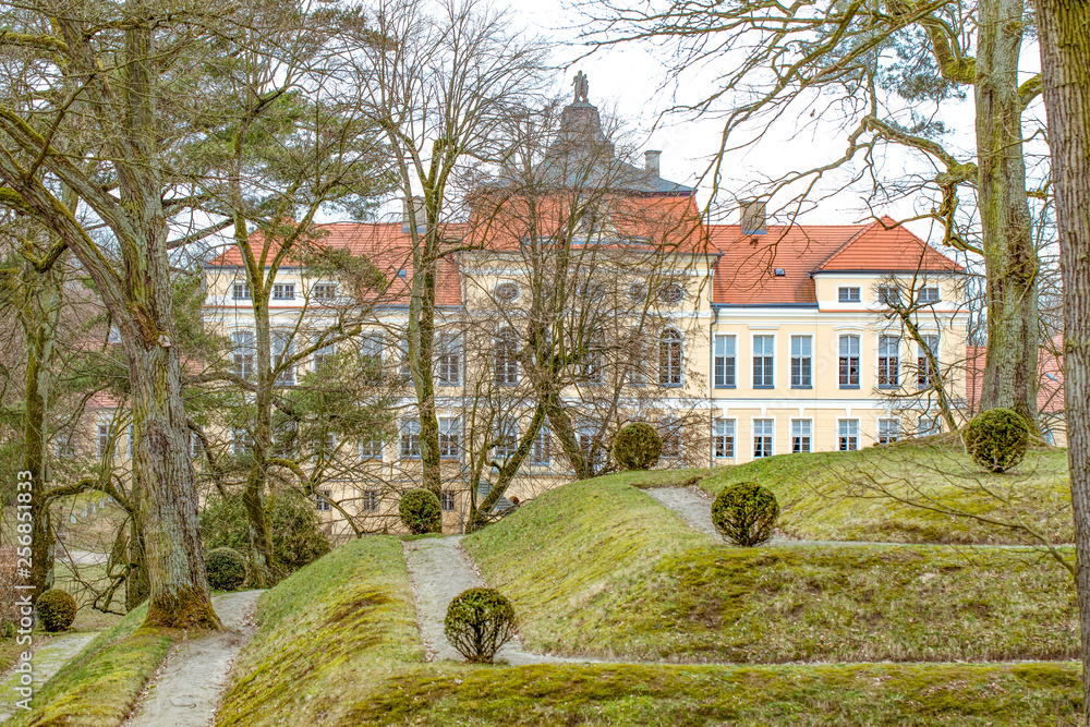 The palace in Rogalin as seen from the park side. Poland. Landscape Park and its oak trees.