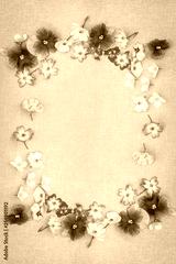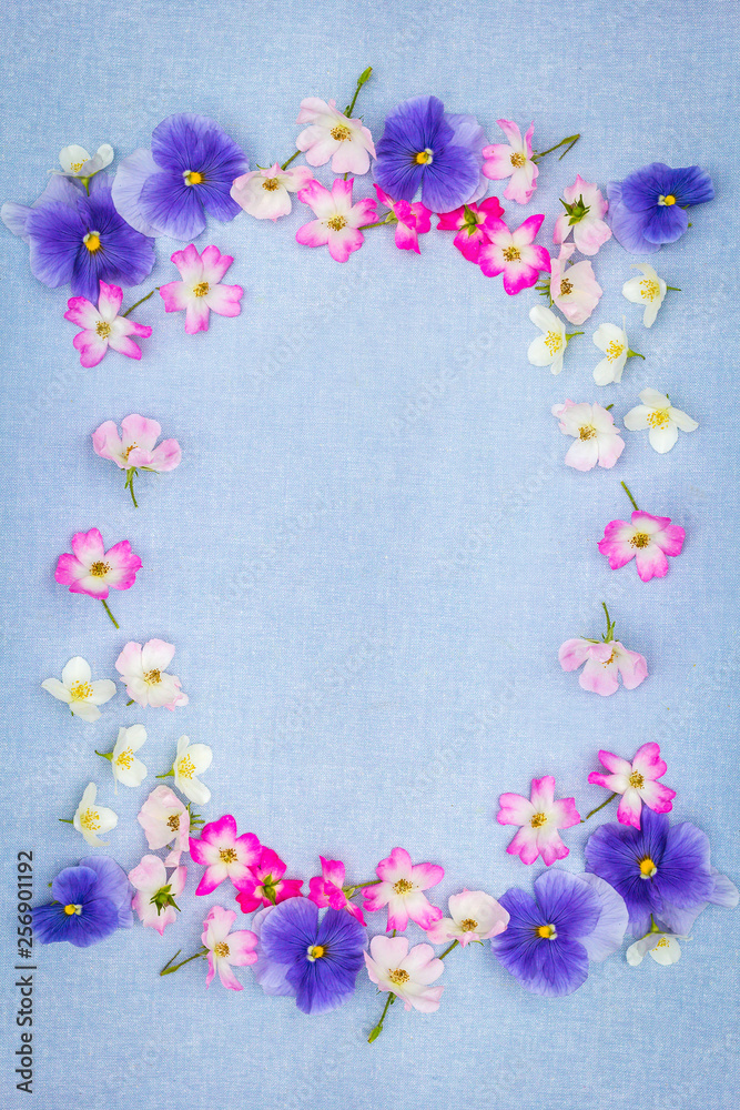 Beautifuil, natural frame with violet pansies and pink roses on blue, fabric background