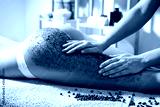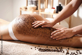 Close up of woman getting buttocks and legs massage with coffee scrub at spa. Using coffee beans for perfect skin and body.