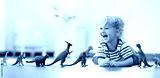 Child playing with toy dinosaurs. Kids toys.