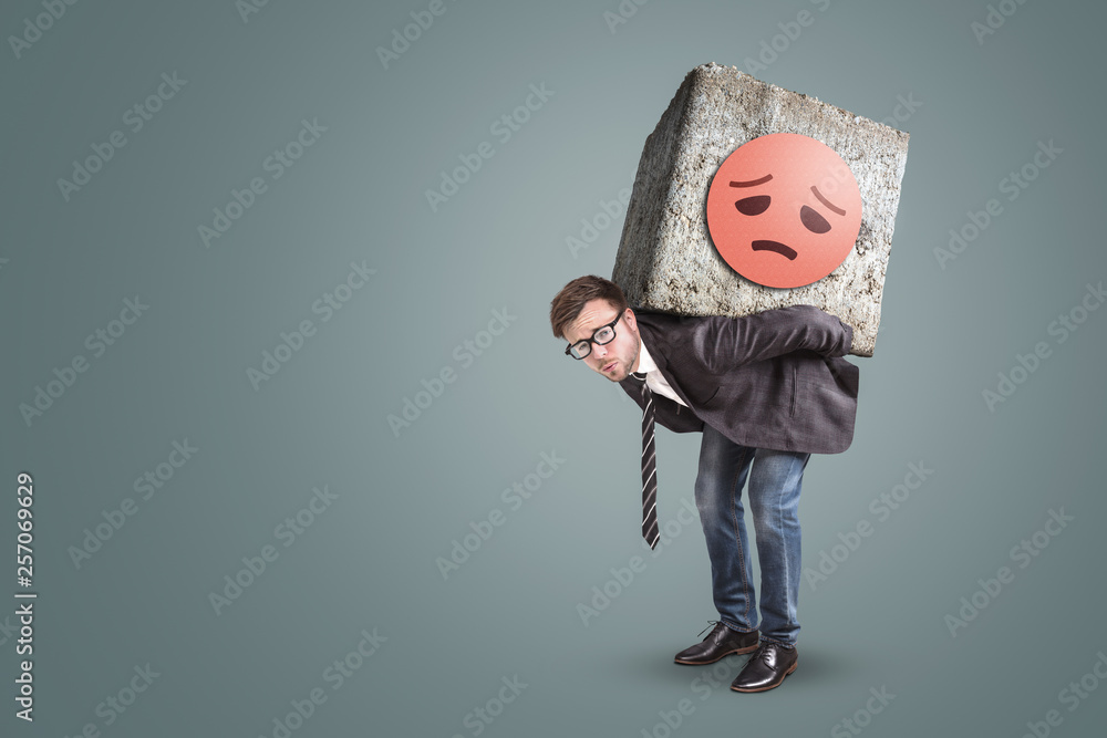 Unglücklicher Unternehmer trägt einen schweren Stein auf dem Rücken