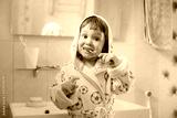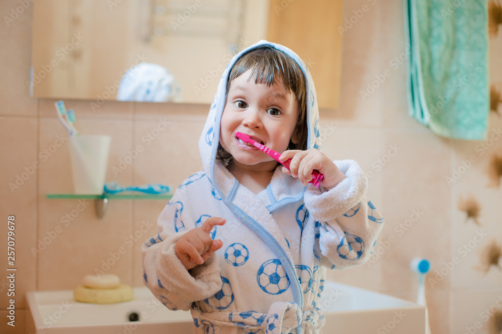 A little girl or child brushes teeth in the bathroom. Hygiene of the oral cavity.