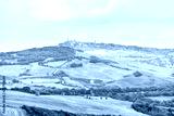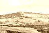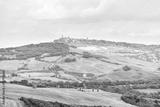 Pienza skyline and Italy Val D'Orcia countryside in Tuscany with hilltop small town village high angle cityscape
