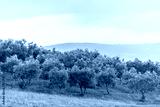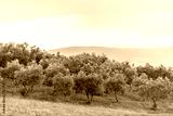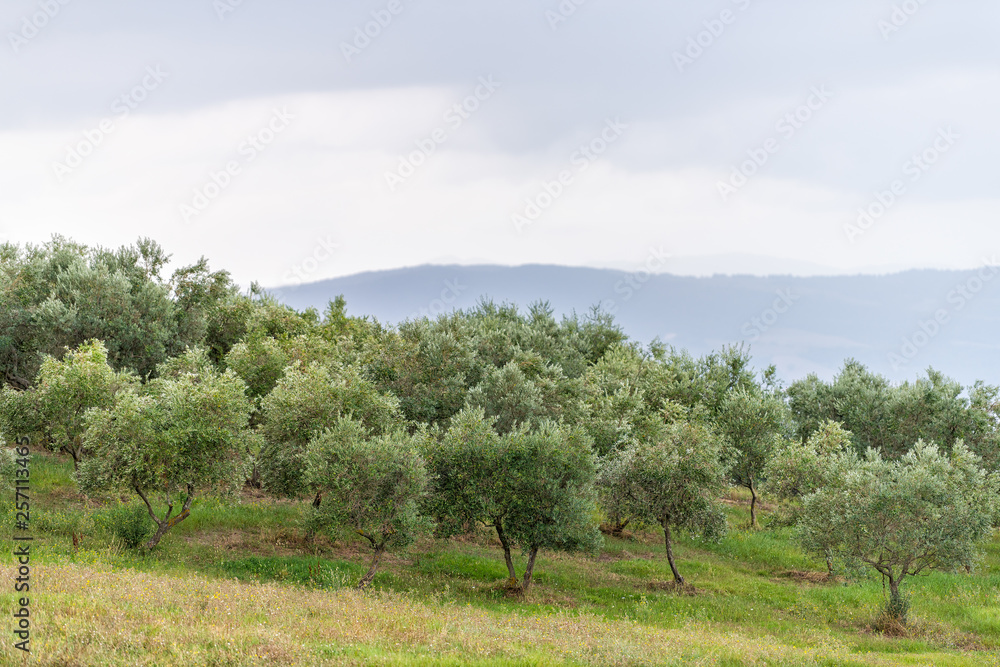 Olive trees in orchard on hill mountain in Val D'Orcia countryside in Tuscany Italy with many green plants