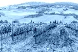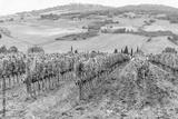 Tuscany, Italy with rolling brown hills and villas with farm landscape winery vineyard grape vine rows in idyllic picturesque Val D'Orcia countryside