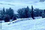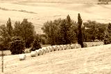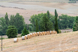 Autumn countryside in Val D'Orcia Tuscany, Italy with hay stray bales rolling plowed brown hills farm landscape meadow fields high angle